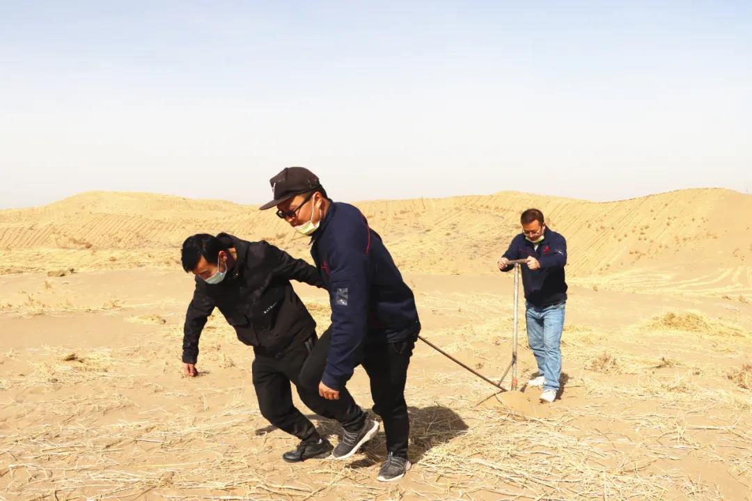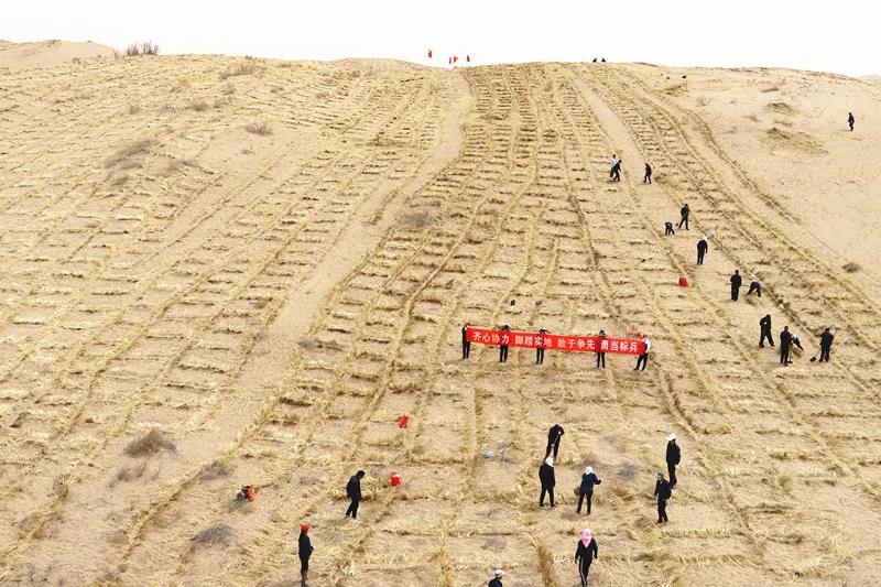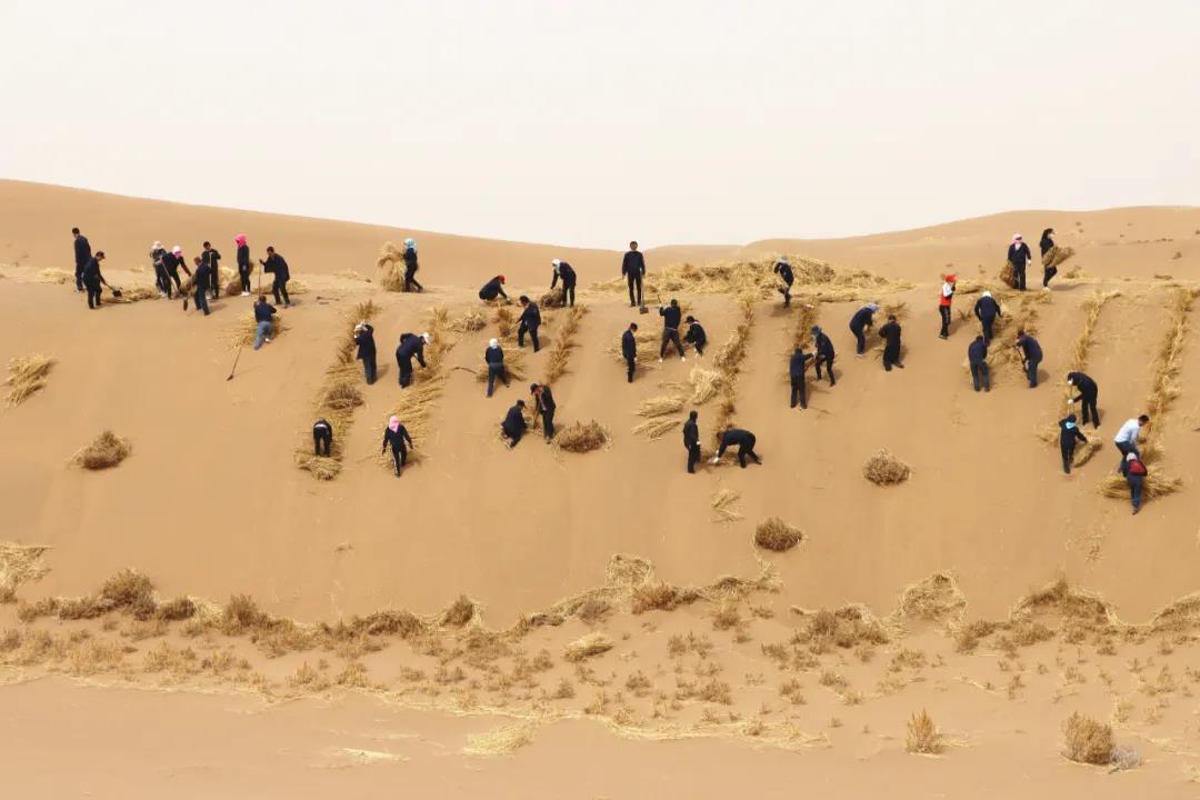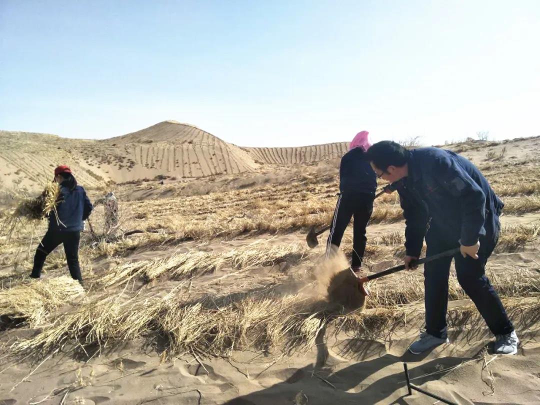 “壓沙前,先要在沙丘上按設(shè)置方向、間距或網(wǎng)格劃好設(shè)置線。背風坡,壓豎道;迎風坡,就要橫豎格子全壓。先開寬25厘米、深20厘米的沙溝,將稻草在沙溝上均勻無間斷鋪好,再將沙子壓實在稻草中間,將兩邊翹起的稻草用沙淤起與沙面垂直,扶成“雙眉式”……大家仔細聆聽了區(qū)林草局技術(shù)人員的詳細講解和指導后,很快掌握了規(guī)范的壓沙方法和要求,各小組迅速投入到熱火朝天的防沙壓沙活動中。
