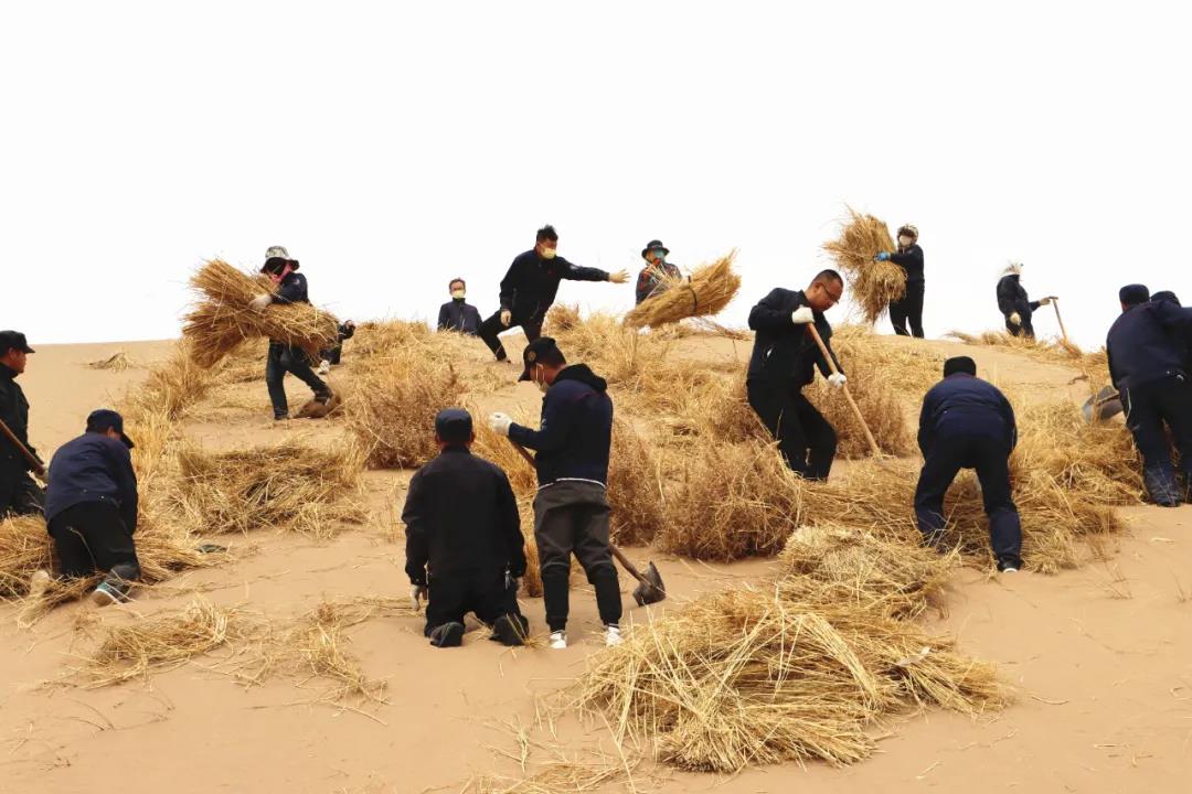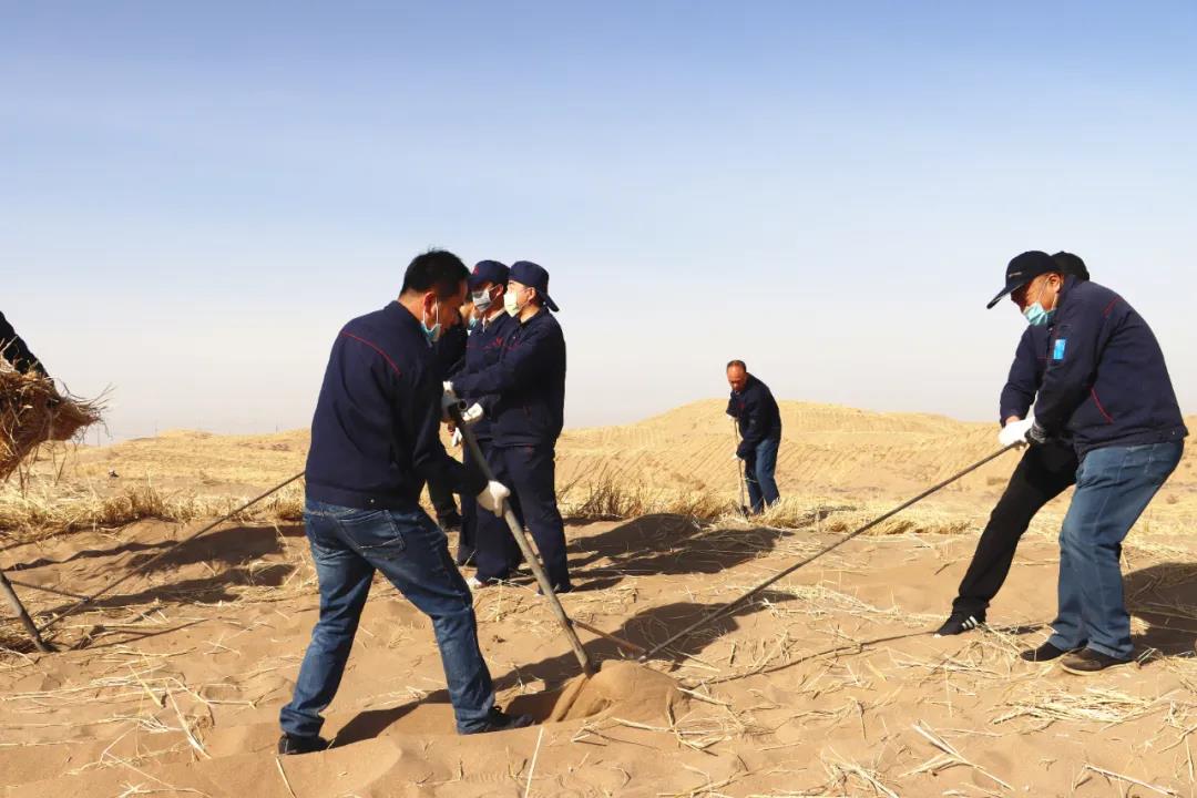 一大早,職工們在皇臺酒業(yè)總經(jīng)理楊利兵的帶領(lǐng)下,精神飽滿地趕赴至涼州區(qū)榮生路紅水河榮華大橋向東21公里處的治沙現(xiàn)場。