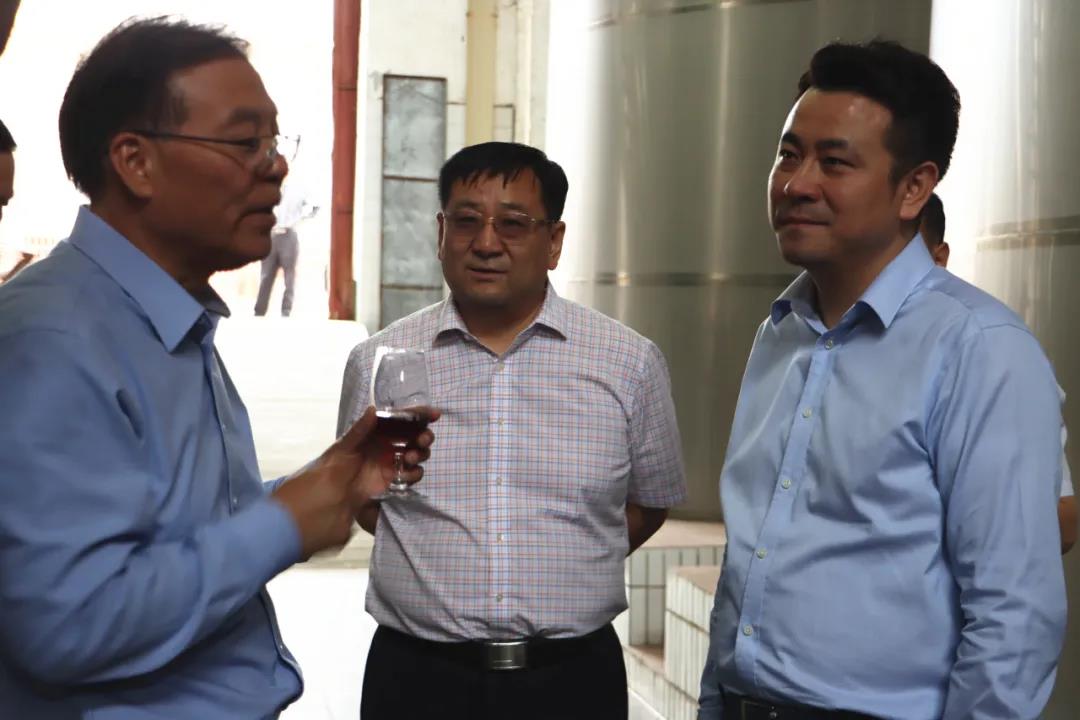 調(diào)研組一行在葡萄酒貯藏車間品嘗葡萄原酒