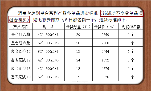 各位親,不論您是婚宴喜事,還是喬遷新居;不論是商超進(jìn)貨,還是好酒收藏……只要您進(jìn)購以下同等價值的皇臺美酒,即可獲得一場說走就走的七彩云南雙飛6日游的美好之旅。