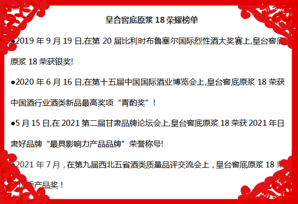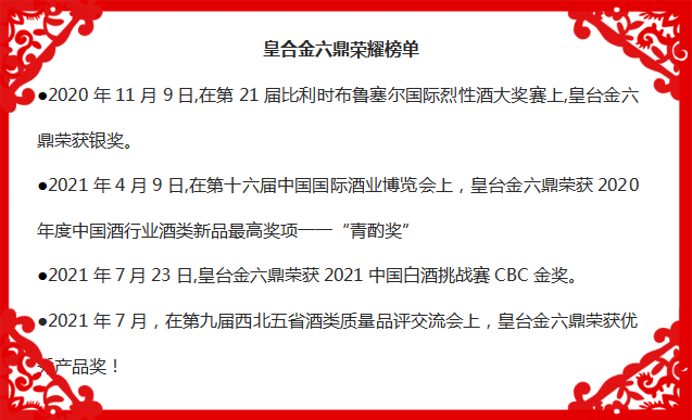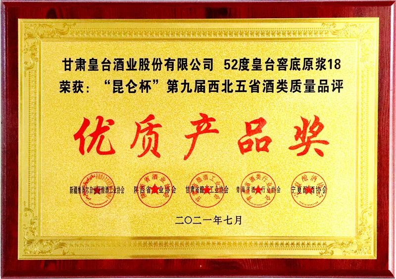 西北五省(區(qū))協(xié)會(huì)于 2021 年 7 月 17—20 日在新疆維吾爾自治區(qū)喀什市召開了“西北五省(區(qū))第九屆酒類質(zhì)量品評(píng)交流會(huì)”,在此交流會(huì)上,皇臺(tái)窖底原漿18和皇臺(tái)金六鼎分別捧獲優(yōu)質(zhì)產(chǎn)品獎(jiǎng)和優(yōu)秀產(chǎn)品獎(jiǎng)!
