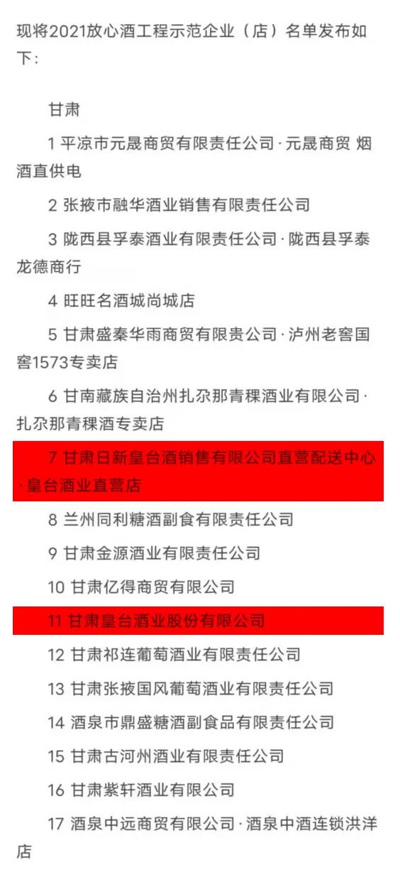 12月中旬,2021中國(guó)酒類流通酒類流通協(xié)會(huì)放心酒工程示范企業(yè)(店)名單發(fā)布,甘肅皇臺(tái)酒業(yè)股份有限公司和甘肅日新皇臺(tái)酒銷售有限公司直營(yíng)配送中心·皇臺(tái)酒業(yè)直營(yíng)店雙雙榮登2021年中國(guó)酒類流通協(xié)會(huì)放心酒工程示范企業(yè)(店)榮譽(yù)殿堂。