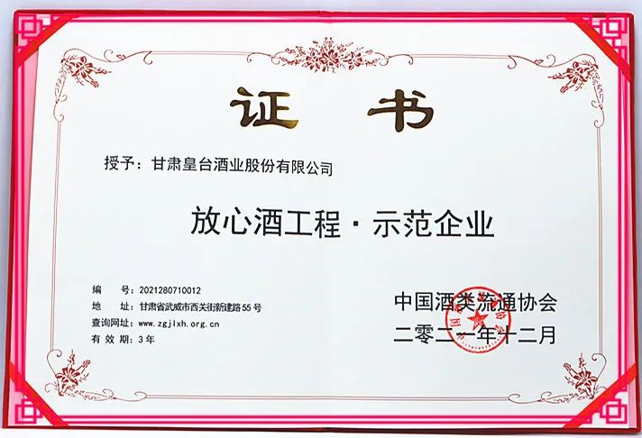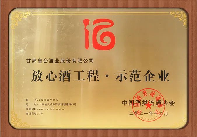 質(zhì)量是一個(gè)企業(yè)的生命線,“以質(zhì)量求生存,”是皇臺(tái)酒業(yè)至始至終的發(fā)展理念?;逝_(tái)曾連續(xù)多年榮獲甘肅省名牌產(chǎn)品稱號(hào),被中國質(zhì)量萬里行市場調(diào)查中心授予“國家監(jiān)督檢查產(chǎn)品質(zhì)量知名品牌”,被中國質(zhì)量檢驗(yàn)協(xié)會(huì)授予“全國質(zhì)量檢驗(yàn)合格穩(wěn)定產(chǎn)品”稱號(hào)。公司為確保產(chǎn)品質(zhì)量安全為首要任務(wù),實(shí)施各層級(jí)、各崗位嚴(yán)格管理,建立并完善全員、全過程、全方位的質(zhì)量管理體系。始終把誠信作為企業(yè)立足的基石,實(shí)實(shí)在在釀糧食酒、放心酒、安全酒。 此次,皇臺(tái)酒業(yè)被中國酒類流通協(xié)會(huì)授予“放心酒工程·示范企業(yè)”等榮譽(yù),不僅證明了皇臺(tái)酒業(yè)產(chǎn)品的優(yōu)質(zhì),體現(xiàn)了行業(yè)及消費(fèi)者對(duì)企業(yè)的認(rèn)可和支持,而且也彰顯了皇臺(tái)酒業(yè)不忘初心,主動(dòng)作為,勇于擔(dān)當(dāng)?shù)纳鐣?huì)責(zé)任心。