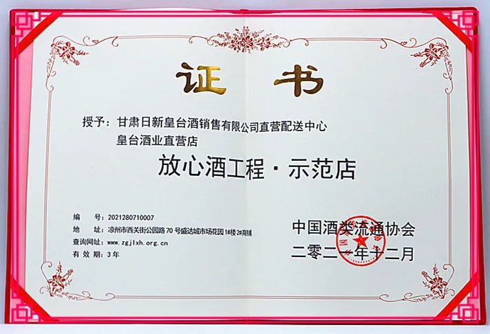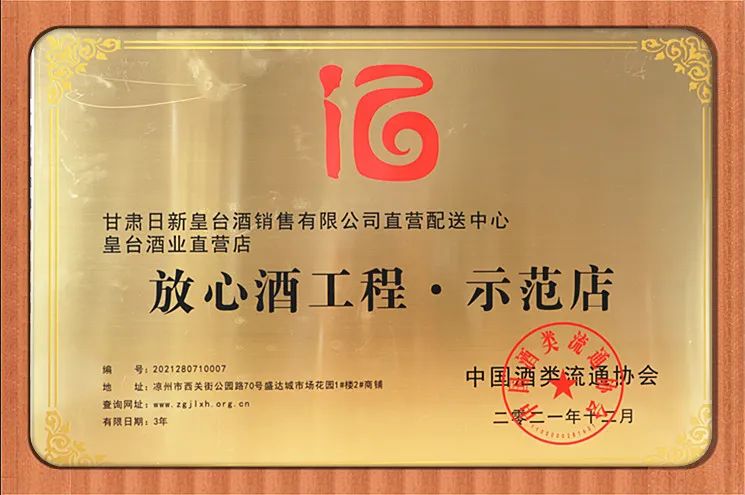 皇臺(tái)酒業(yè)直營店被中國酒類流通協(xié)會(huì)授予