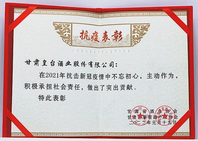 2022年1月25日,為迎接新的奮斗征程、激發(fā)新的發(fā)展動(dòng)力,搭建好交流學(xué)習(xí)、互通有無、資源對(duì)接的服務(wù)平臺(tái),更好地推動(dòng)全省酒類行業(yè)的健康有序發(fā)展,甘肅省酒業(yè)協(xié)會(huì)舉辦“迎新春聯(lián)誼會(huì)暨表彰大會(huì)”。大會(huì)上,甘肅皇臺(tái)酒業(yè)股份有限公司被中國酒類流通協(xié)會(huì)授予2021年中國酒類流通協(xié)會(huì)放心酒工程示范企業(yè),甘肅日新皇臺(tái)酒銷售有限公司直營配送中心·皇臺(tái)酒業(yè)直營店被授予2021年中國酒類流通協(xié)會(huì)放心酒工程示范店。公司董事、總經(jīng)理代繼陳代表公司上臺(tái)領(lǐng)獎(jiǎng)。