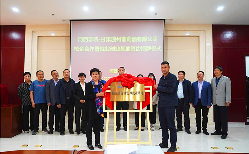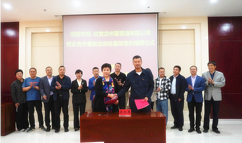甘肅涼州葡萄酒有限公司副總經(jīng)理潘濤介紹了公司的基本情況、優(yōu)勢特色和發(fā)展理念,希望與河西學(xué)院在人才培養(yǎng)和產(chǎn)教融合方面有深度合作,希望學(xué)校為企業(yè)培養(yǎng)輸送緊缺人才,相關(guān)專業(yè)教師利用專業(yè)特長解決企業(yè)問題,實現(xiàn)校企共建人才培養(yǎng)、共建科技創(chuàng)新平臺和咨詢服務(wù)。強梅與潘濤簽署了校企合作暨就業(yè)創(chuàng)業(yè)協(xié)議,并舉行了“校企合作暨就業(yè)創(chuàng)業(yè)基地”授牌儀式。