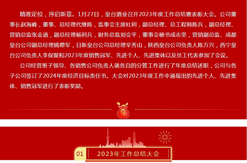 在2023年度工作總結(jié)大會(huì)上,公司董事長(zhǎng)趙海峰強(qiáng)調(diào):2023年,隨著國(guó)內(nèi)經(jīng)濟(jì)穩(wěn)步復(fù)蘇,白酒行業(yè)形勢(shì)復(fù)雜的諸多困難,我們不畏艱險(xiǎn),砥礪前行,百折不撓,乘勢(shì)而上,雖然步履依然艱難,但我們走得堅(jiān)實(shí)而有力量,銷(xiāo)售持續(xù)回升向好,品牌復(fù)興扎實(shí)推進(jìn)。這一年,公司的核心競(jìng)爭(zhēng)力有了顯著提升,銷(xiāo)售團(tuán)隊(duì)的凝聚力和戰(zhàn)斗力逐步增強(qiáng),公司上下呈現(xiàn)出了爭(zhēng)先恐后、比學(xué)趕超的良性競(jìng)爭(zhēng)氛圍。這一年,各崗位新鮮血液持續(xù)輸入,我們欣喜地看到,公司年輕隊(duì)伍正在壯大,部分人才迅速嶄露頭角,年輕一代正在成為公司發(fā)展的中堅(jiān)力量,為企業(yè)的可持續(xù)發(fā)展提供了堅(jiān)實(shí)基礎(chǔ)?;仡欉^(guò)去,展望未來(lái),我們深感肩負(fù)的使命和責(zé)任,過(guò)去的一年,我們?nèi)〉昧瞬诲e(cuò)的成績(jī),新的一年,面對(duì)白酒行業(yè)的復(fù)雜形勢(shì)和種種挑戰(zhàn),我們?nèi)匀恍枰恍概?,繼續(xù)書(shū)寫(xiě)新一年的輝煌篇章。