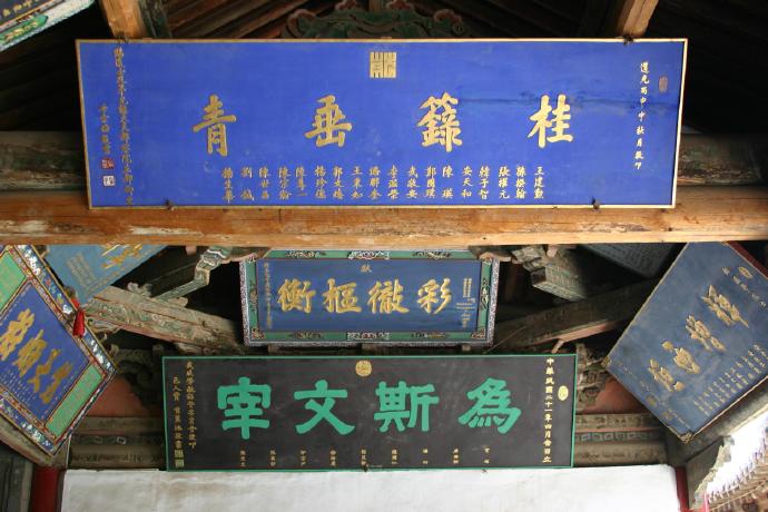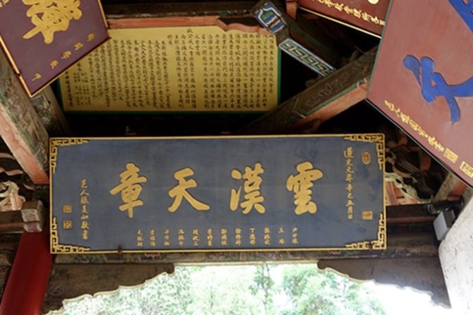 四十四塊牌匾中,除以上所述之外:“化峻天樞”,題于康熙五十八年;“德盛化神”匾,題于雍正九年;“司文章命”匾,特簡文林郎知武威縣事王守曾題于乾隆四年;“掌仙桂籍”匾,鄭松齡題于乾隆四年;“陽春一曲”,于雍正元年題寫;“文明長晝”,曾國瑛于乾隆十一年題寫;“聚精揚紀”,于嘉慶十一年,甘肅按察使司按察使、前分守甘涼兵備道劉大懿題寫;“云漢天章”,張美如題寫于道光年間;“天下文明”,牛鑒題寫于道光十九年;“文以載道”,王步瀛題寫于宣統(tǒng)建元己酉秋;“文明以正”,民國六年題寫……“斯文主宰”,為文昌宮山門橫批;“月滕殿輝”,為桂籍殿門前牌樓橫批。其中“書城不夜”和“聚精揚紀”兩塊牌匾,被收錄進中華名匾。