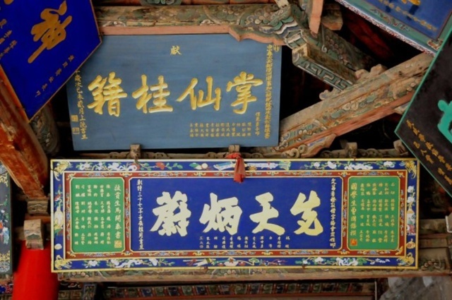 歷史上的諸多文物,有些能熬過千年的時空歲月,卻未能熬過天災和人為破壞。桂籍殿廊檐下的牌匾,能幸運地躲避日月流轉中的風霜刀劍,且毫發(fā)未傷保存至今,實屬事出有因:民國末年,國民黨設武威縣參議會,文昌宮桂籍殿被用作參議會辦公室,由于屋架高大,天涼時,殿內陰冷難耐,大家便給高大的廊檐打了低矮的頂棚,并在常規(guī)五間寬的廊檐下砌起了隔墻,修起了墻壁,安上門窗,將其改造成低矮保暖的參議會辦公室。